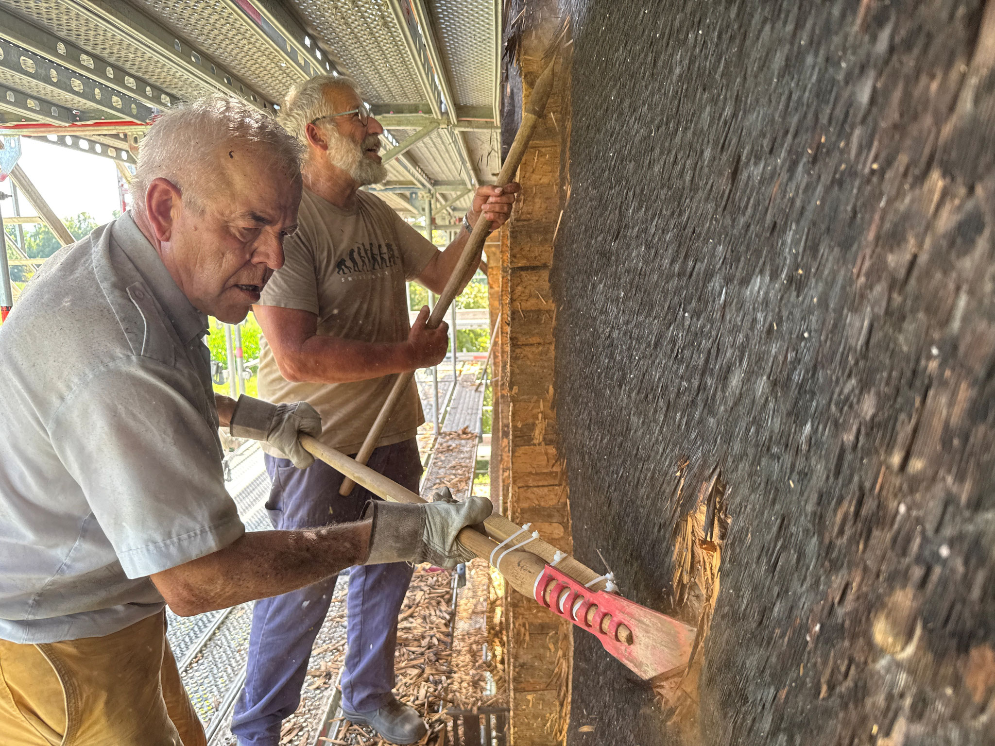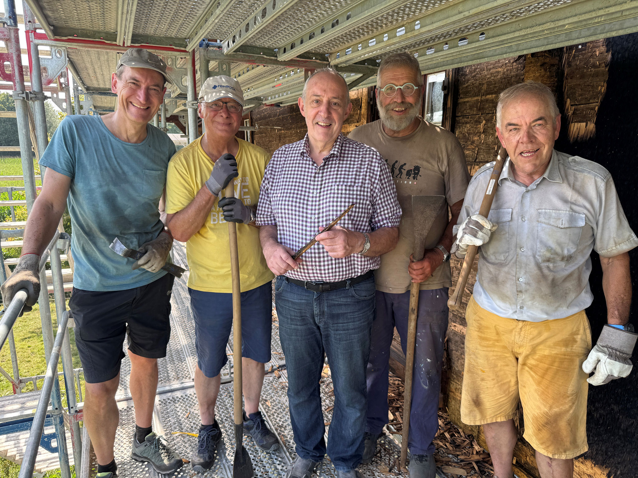 Die Sanierung der Ronmühle in Schötz hat begonnen. Pünktlich zum Ende der Sommerferien sind die Bauarbeiten gestartet. Letzte Woche wurde das Gerüst erstellt. Gleichzeitig haben Freiwillige des Vereins Museum Ronmühle mit der Entfernung der alten Schindeln begonnen.