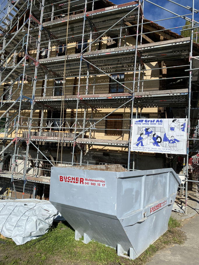 In den nächsten Wochen werden vor allem die Arbeiten draussen fortgesetzt. Dies beinhaltet zum Beispiel die Fertigstellung der Tieferlegung des Raums neben dem Ronmühlekeller sowie der Erstellung des Lift- und Treppenhausanbaus auf der Nordseite. Ebenso wird auch an der Sanierung der Aussenhülle weiter gearbeitet. So werden die Aussenwände noch isoliert, neue Fenster eingesetzt und auf drei Seiten mit neuen Schindeln verkleidet. Das Dach wird ebenfalls richtig isoliert und neu gedeckt, damit das Dachgeschoss auch als Ausstellungsraum genutzt werden kann. Diese Arbeiten sollten bis zum Beginn der kälteren Jahreszeit abgeschlossen sein.